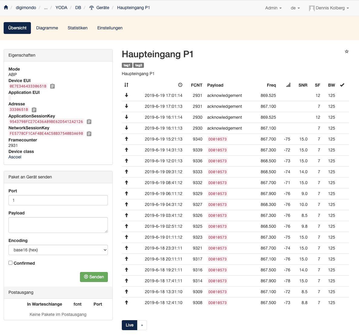 Das Packet Journal ist die schnellste Sicht für den operativen Zustand eines Geräts. Uplinks, Downlinks und MAC-Ereignisse lassen sich dort gemeinsam beurteilen; so werden Signalqualität, FCNT-Verhalten, Ack-Zustände und offensichtliche Funkprobleme sehr schnell erkennbar.