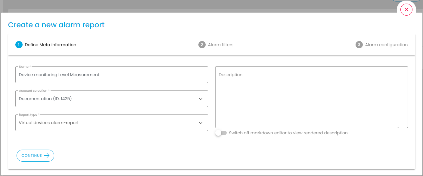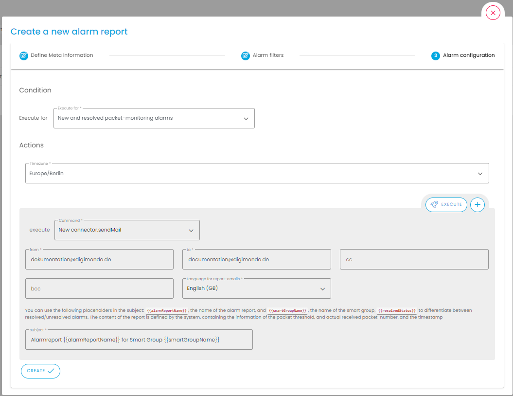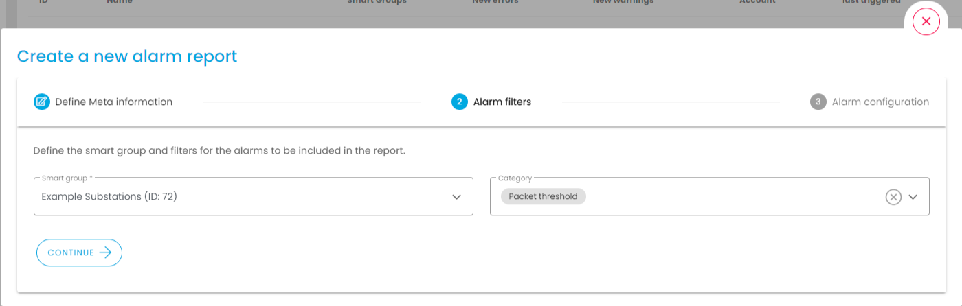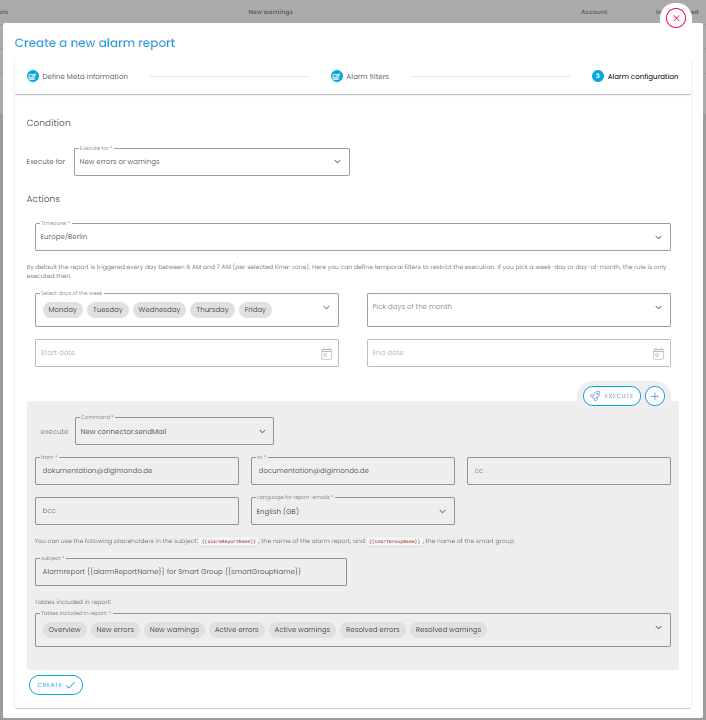 Alarm reports are created via the Create button () in three steps: