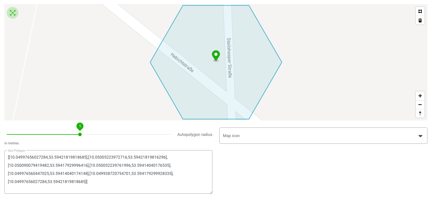 As soon as you enter an address, a static polygon is automatically created around each map icon of a digital twin, the radius you can freely set using the button below the map. This allows you to visualize the status of moving digital twins in the map. If you move only the map icon in the map, the polygon will move accordingly. If you click on the polygon, you can move it individually or delete it by clicking on the trash can icon in the map for the current view. You cannot save this view, it will automatically create a new polygon when you open the twin again. Below the map you will find the field “Geo Polygon”, where the latitude and longitude are automatically listed.