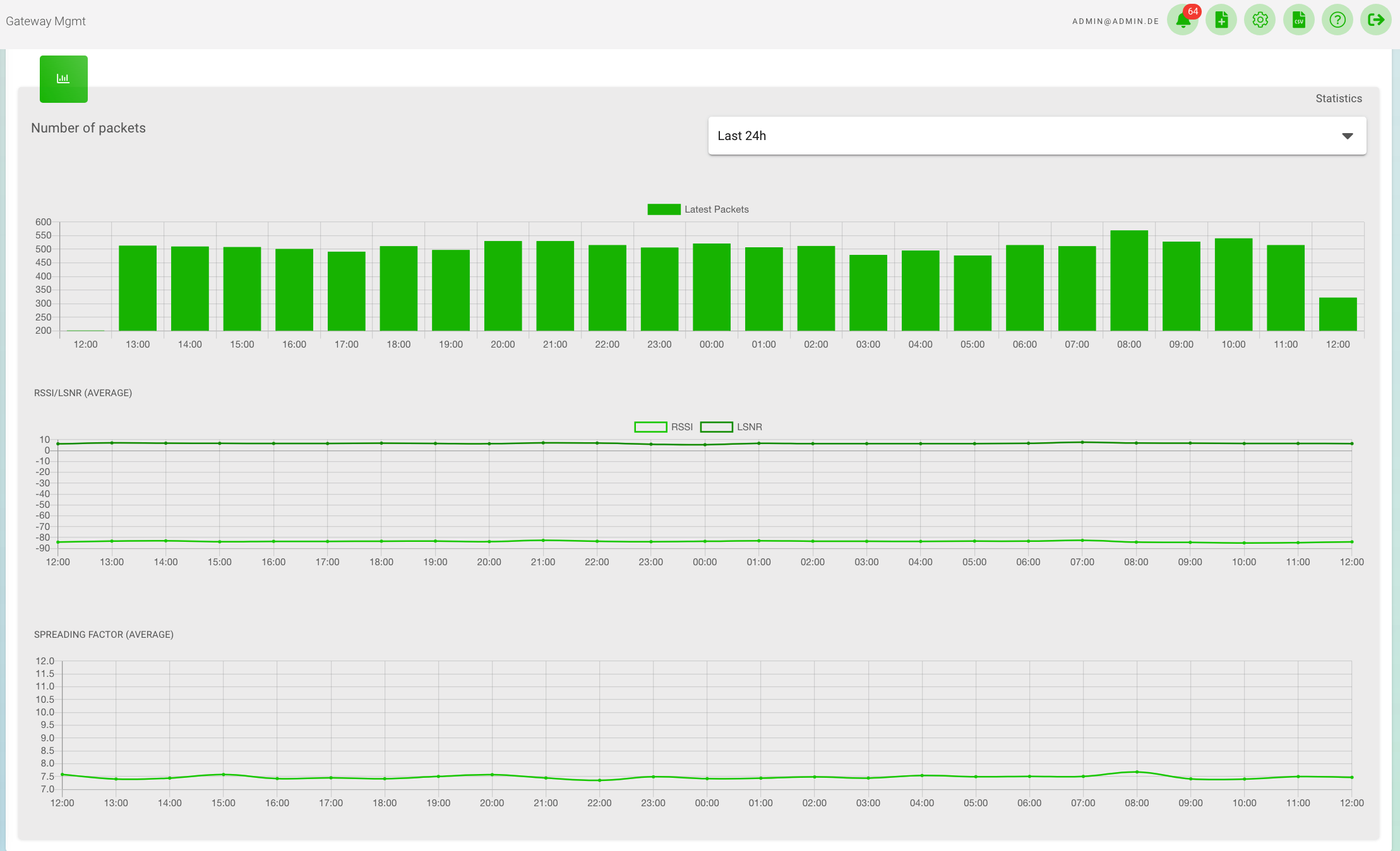 Spreading Factor (SF): This diagram shows the average Spreading Factor of the devices. Spreading Factors are used in the LoRaWANnetwork to set the data transfer rate relative to the range. The Spreading Factor should always be between 7 and 12.