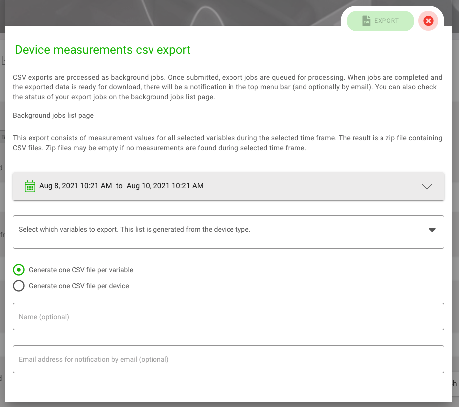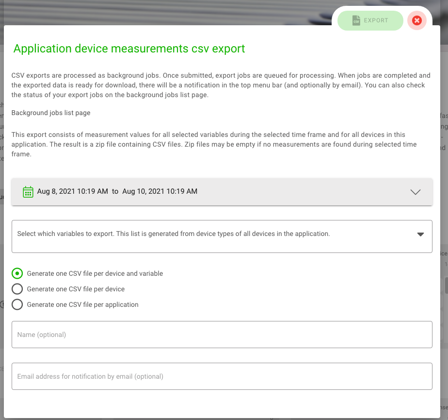 You can select the time period and the variable. You can select whether the CSV file should be generated per device and variable, per device or per application. You can specify an e-mail address to which a download link will be sent after the download is completed. You can find the file by clicking on the “CSV” button in the upper right corner of the menu bar. Then the page “CSV-Export” will open, where you can download the file.