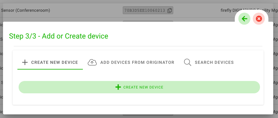 Then the next window appears, in which you click on “Add Originator Devices. ” A menu will open in which you either select all devices by clicking on the button “Select all” or select individual devices by clicking on the cross at the bottom right. The devices that are not yet in an application in niotix via the originator are listed for selection.