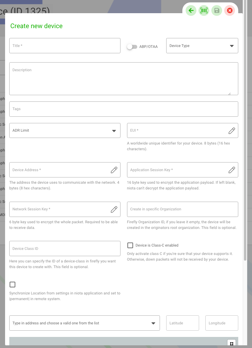 ABP/OTAA:* Activate via the switch “Activation by personalization” (ABP) or “Activation over the air” (OTAA). Depending on which activation method you select for the device, there are different mandatory fields for the process.