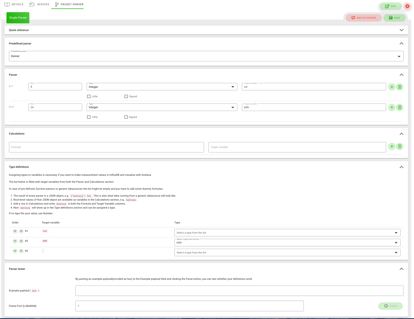 Under the “Packet Parser” tab on the details page, you can configure the parser for this device type. Parsers are used to interpret and decrypt the transmitted payload of the sensor. You can find a quick guide on the parser setup page to better understand the configuration details. You can select a single parser, multi-parser, or a function parser. If no parser is selected, you can choose the parser form on the page. Then a window opens where you can configure the parser.
