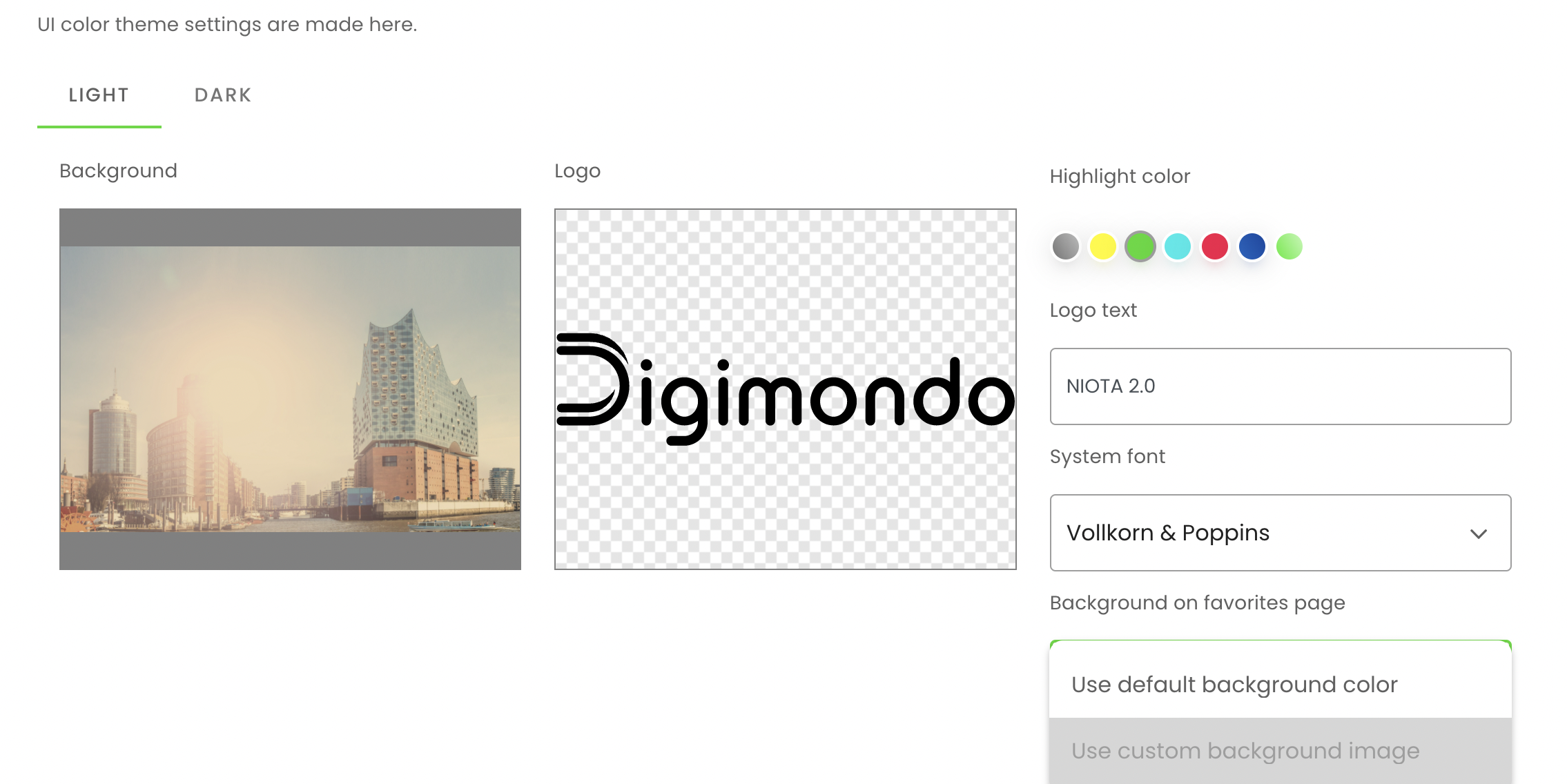 This is only accessible if a domain is set for this account. With the tabs “light” and “dark” you can switch between different themes and customize the wallpaper, logo etc.